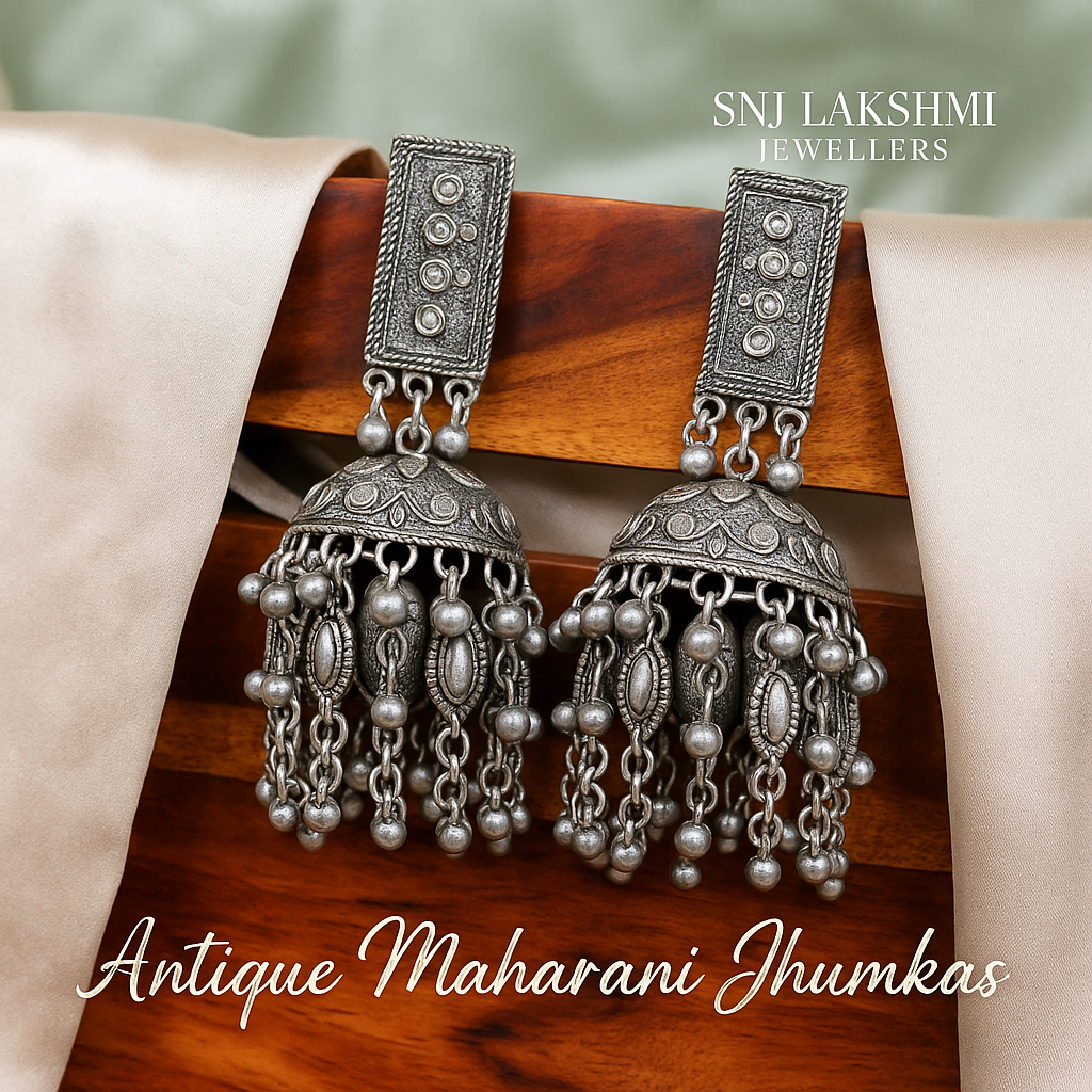 ஆன்டிக் மஹாராணி ஜும்காஸ் பாரம்பரிய கைவினைத் திறனையும் ராஜகிய அழகையும் ஒருங்கிணைக்கும் சிறப்பு நகை. பாரம்பரிய நகைகளிலிருந்து ஈர்க்கப்பட்ட இந்த ஜும்காக்கள் நுணுக்கமான பொறித்தல், அழகான ஆன்டிக் finish மற்றும் பாரம்பரிய டோம் வடிவத்துடன் எந்த திருமண அல்லது விழா உடையையும் மேலும் உயர்த்தும். இலகுவாக அணியக்கூடிய அமைப்பு நாள் முழுவதும் வசதி தரும் போது, ராஜகுமாரி போன்ற ஒரு Grand look-ஐ வழங்குகிறது. திருமணம், கலாச்சார நிகழ்வுகள், சிறப்பு தருணங்கள் அனைத்திற்கும் ஏற்ற இந்த Antique Maharani Jhumkas, ஆடம்பரமான பாரம்பரிய நகைகளை விரும்பும் அனைவருக்கும் ஒரு அழியாத statement piece.