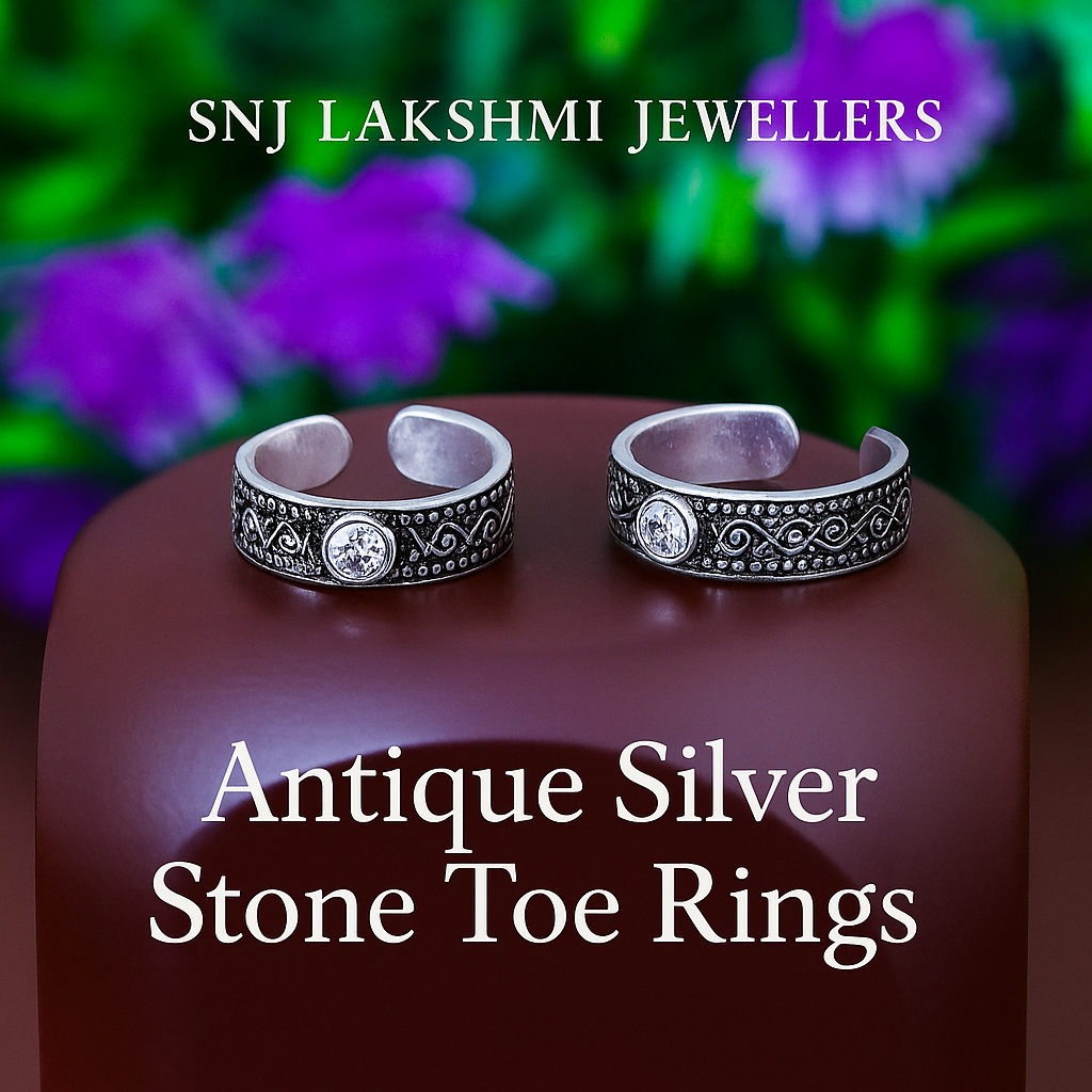 The Antique Silver Stone Toe Rings are beautifully crafted in pure silver, featuring intricate antique detailing with elegant stone embellishments. Designed to reflect timeless heritage charm, these toe rings offer a smooth finish and comfortable fit. Perfect for weddings, poojas, festivals, and even daily wear, they add a regal traditional touch to your overall look.