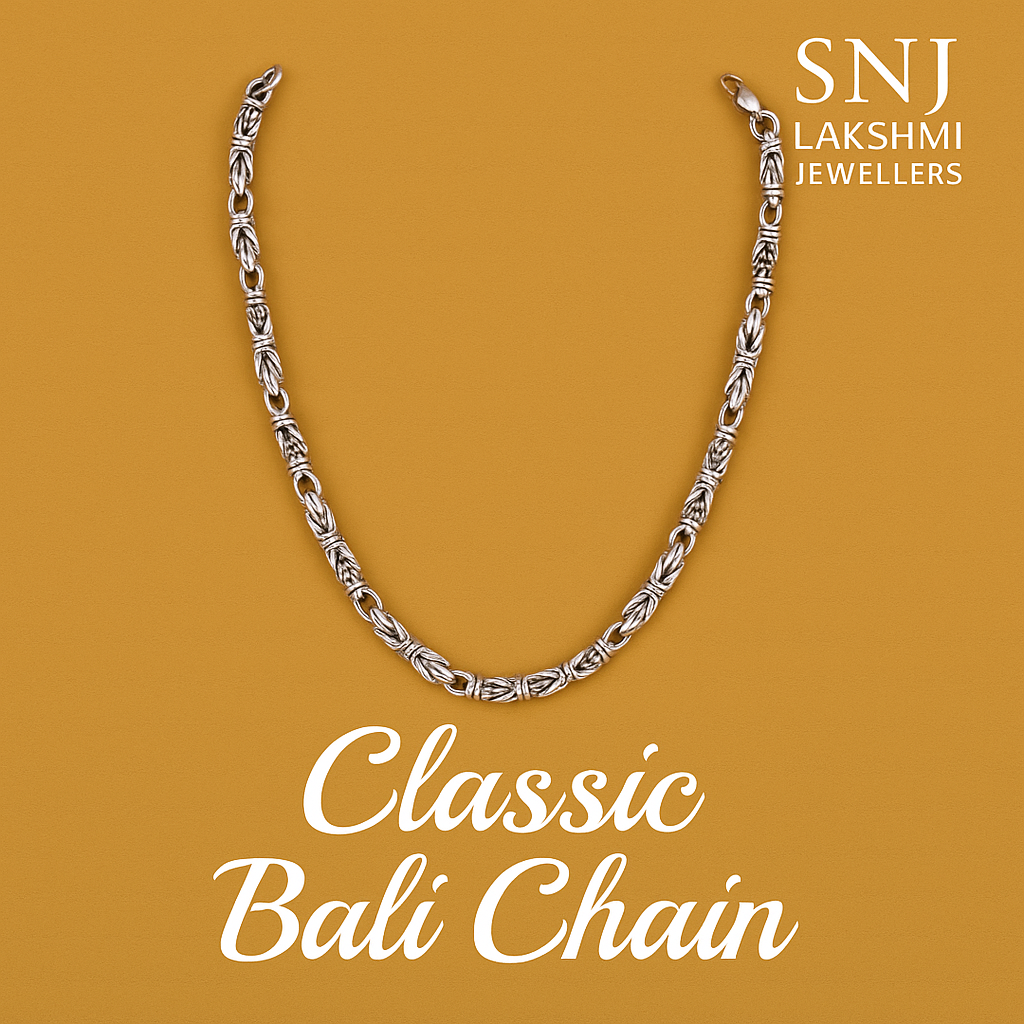 The Classic Bali Chain is a traditional yet stylish masterpiece inspired by the rich Balinese jewelry craftsmanship. Designed with detailed woven links, this chain offers a bold, sturdy, and premium look that suits both men and women. Its intricate texture adds depth and character, making it perfect for festive wear, daily wear, or as a statement accessory. Crafted from high-quality silver, the Classic Bali Chain is durable, skin-friendly, and built to last. A top choice for customers searching for Bali chain designs, silver chains for men, ethnic jewelry, handcrafted chain styles, and premium daily wear chains.