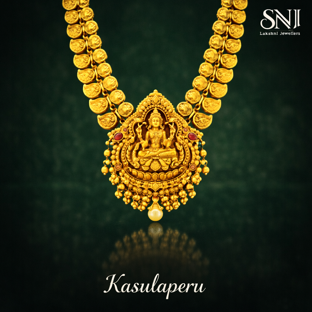 Grand, auspicious, and deeply rooted in tradition, the Kasulaperu is an essential piece for women who cherish heritage jewelry and timeless South Indian craftsmanship.