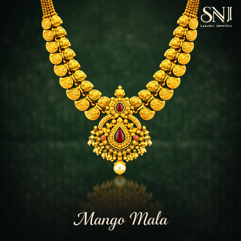 Perfect for bridal wear, weddings, temple ceremonies, and festive celebrations, the mango mala pairs elegantly with silk sarees and traditional attire. Its distinctive design and graceful length add a regal charm to any ethnic ensemble.