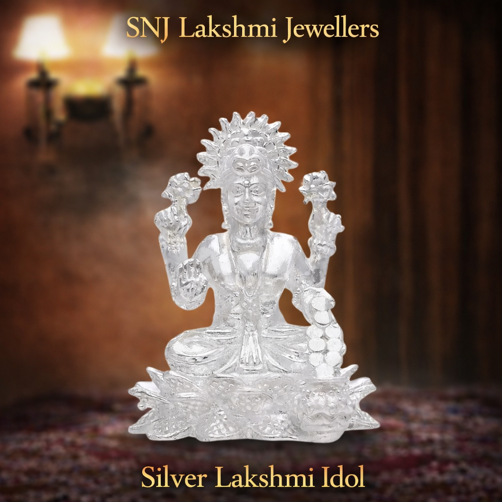 The Silver Lakshmi Idol symbolizes wealth, prosperity, and divine grace. Goddess Lakshmi is worshipped as the goddess of abundance, success, and good fortune, bringing peace and positivity into the home. Crafted with fine detailing and a traditional finish, this silver idol is perfect for daily pooja, festive occasions like Diwali and Varalakshmi Vratham, housewarming ceremonies, and auspicious gifting.