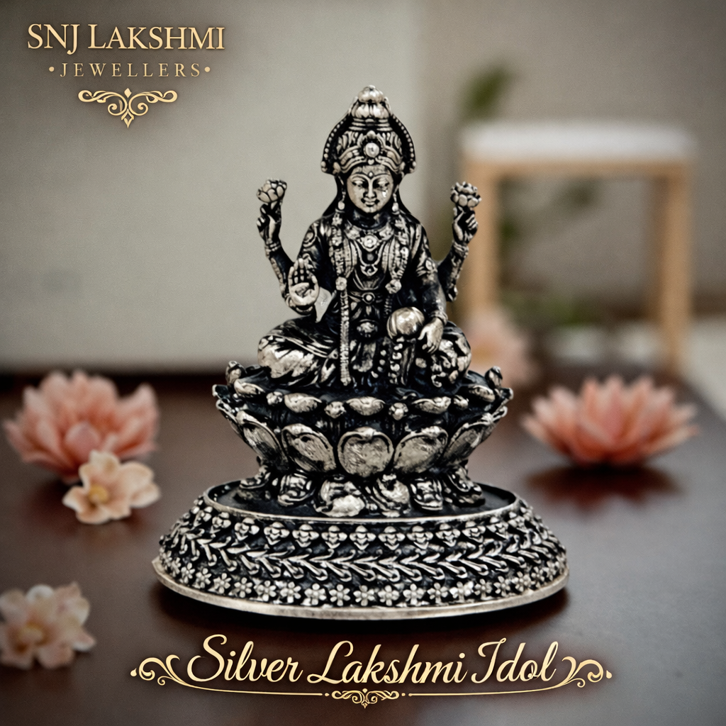 The Silver Lakshmi Idol is a sacred and beautifully crafted silver idol symbolizing wealth, prosperity, abundance, and divine blessings. Made from pure silver with fine detailing, this idol represents Goddess Lakshmi, the deity of fortune and well-being. Ideal for daily pooja, Lakshmi Pooja, Diwali celebrations, and auspicious rituals, placing a Silver Lakshmi Idol in the home or pooja room is believed to invite positive energy, success, and harmony. Its elegant design makes it a meaningful and auspicious gift for weddings, housewarming ceremonies, anniversaries, and spiritual occasions.