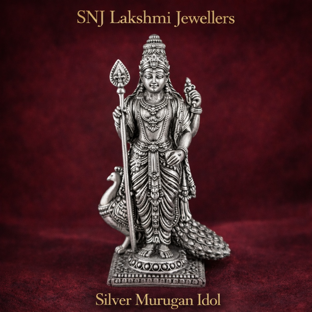 The Silver Murugan Idol represents courage, wisdom, and divine protection. Lord Murugan, the symbol of victory and knowledge, is widely worshipped for strength, success, and spiritual growth. Crafted with fine detailing and a traditional finish, this silver idol is ideal for home pooja, temples, festive occasions like Thaipusam and Skanda Sashti, and as an auspicious gift for loved ones.