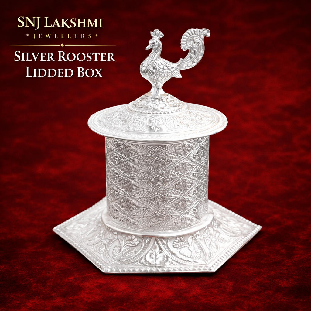 வெள்ளி சேவல் மூடியுடன் கூடிய பெட்டி என்பது செழிப்பு, பாதுகாப்பு மற்றும் நல்ல சக்தியை குறிக்கும் பாரம்பரிய வெள்ளிப் பொருளாகும். நுணுக்கமான கலை வடிவமைப்புடன், மூடியின் மேல் சேவல் வடிவம் அமைந்துள்ளது, இது ஆன்மீகத்தையும் அழகையும் ஒருங்கிணைக்கிறது.குங்குமம், மஞ்சள், பூஜை பொருட்கள், நாணயங்கள் அல்லது சிறிய நகைகள் வைத்திருப்பதற்கு இந்த வெள்ளி மூடியுள்ள பெட்டி சிறந்தது. வீட்டு பூஜை அறை, கோவில் வழிபாடு, பண்டிகைகள் மற்றும் சுப நிகழ்ச்சிகளில் இது பெரிதும் பயன்படுத்தப்படுகிறது.